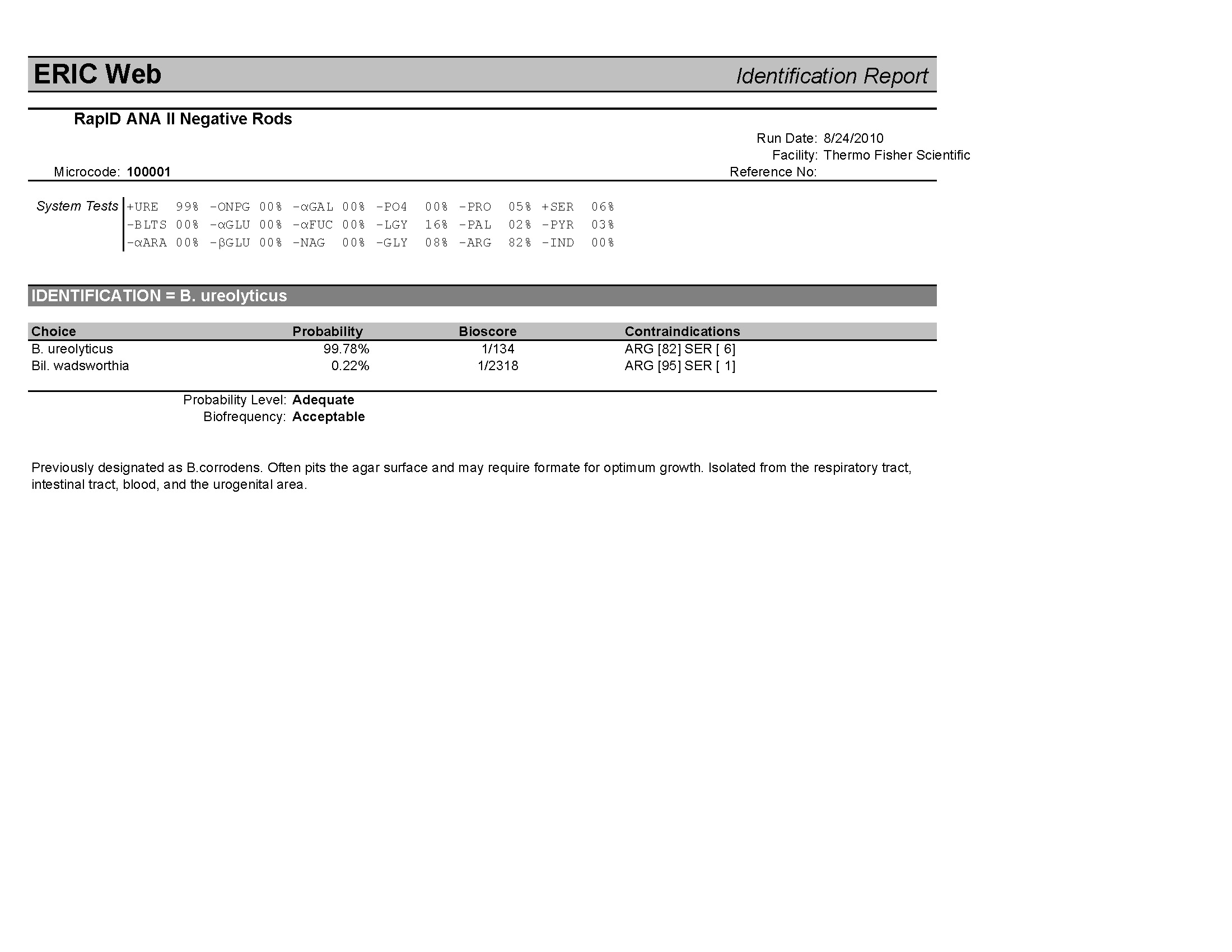 ERIC® is an internet-based software electronic code compendium designed to work exclusively with Remel RapID™ Systems. It includes all information provided online by the Windows®-based software previously only on CD, including probability percent, bioscores, contraindicated test results, accessory tests, and clinically relevant comments. Easy to use and reliable, ERIC offers an expanded database and updated nomenclature. Please contact a local Sales or Technical Service Representative for more information.